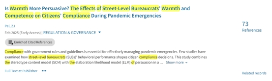 论文题目:Is Warmth More Persuasive? The Effects of Street-Level Bureaucrats' Warmth and Competence on Citizens' Compliance During Pandemic Emergencies