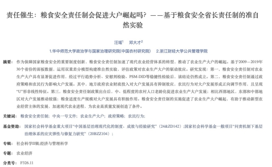 论文题目:责任催生:粮食安全责任制会促进大户崛起吗?——基于粮食安全省长责任制的准自然实验