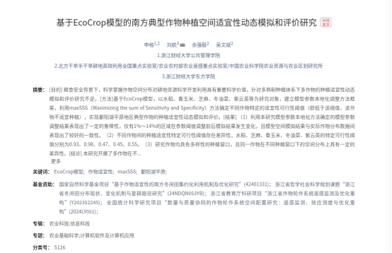 论文题目:基于EcoCrop模型的南方典型作物种植空间适宜性动态模拟和评价研究