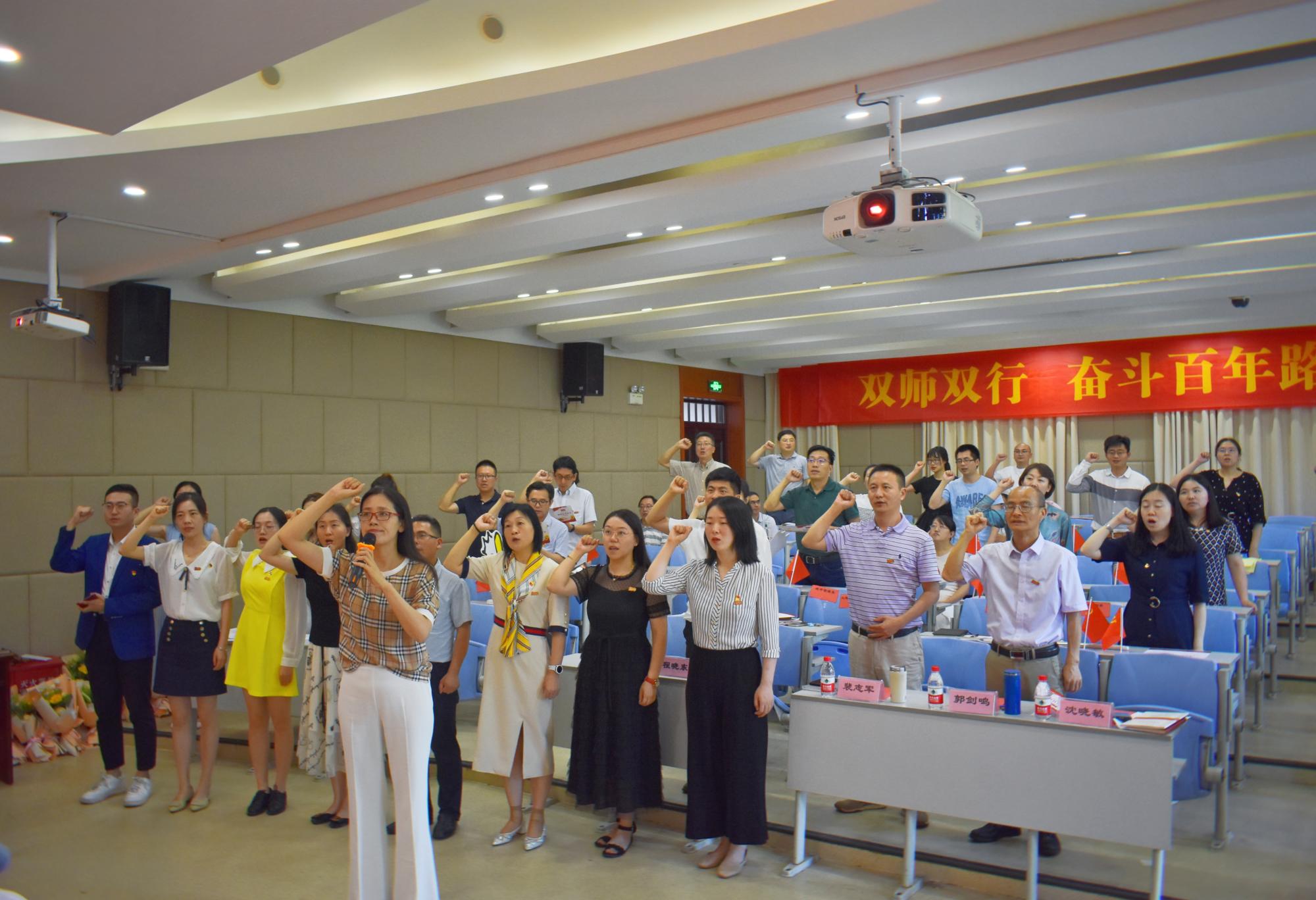活动在庄严的重温入党誓词中拉开帷幕,学院党委书记沈晓敏带领全体教工党员面向党旗,高举右手,庄严宣誓,表达了全体教职工不忘初心、牢记使命,为党的事业不懈奋斗的信念和决心。