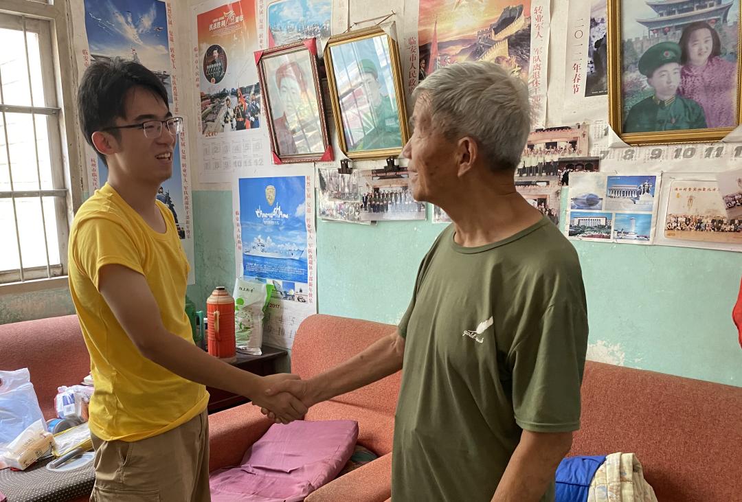 团队前往湍口村居委会,满怀热忱地与村内党员前辈们会面。第一位见面的,是于1981年3月2日入党的湍口村第一任党支部书记叶老同志。湍口地区在叶书记的带领下,村子农业逐步发展,在上世纪改革开放之后才逐步解决温饱问题。7月13日上午,在村子负责人的带领下团队踏入了九旬老兵——潘涛老先生的家门。款式老旧的电风扇与沙发、贴满墙壁的党建挂历,进入这小小房间的一刹,学生们似乎随潘老先生一同回到了过去。凤凰山脚下的这小小一隅村落,见证了党员前辈的奋进。苍翠山间,仍回荡着“为人民服务”的余音。