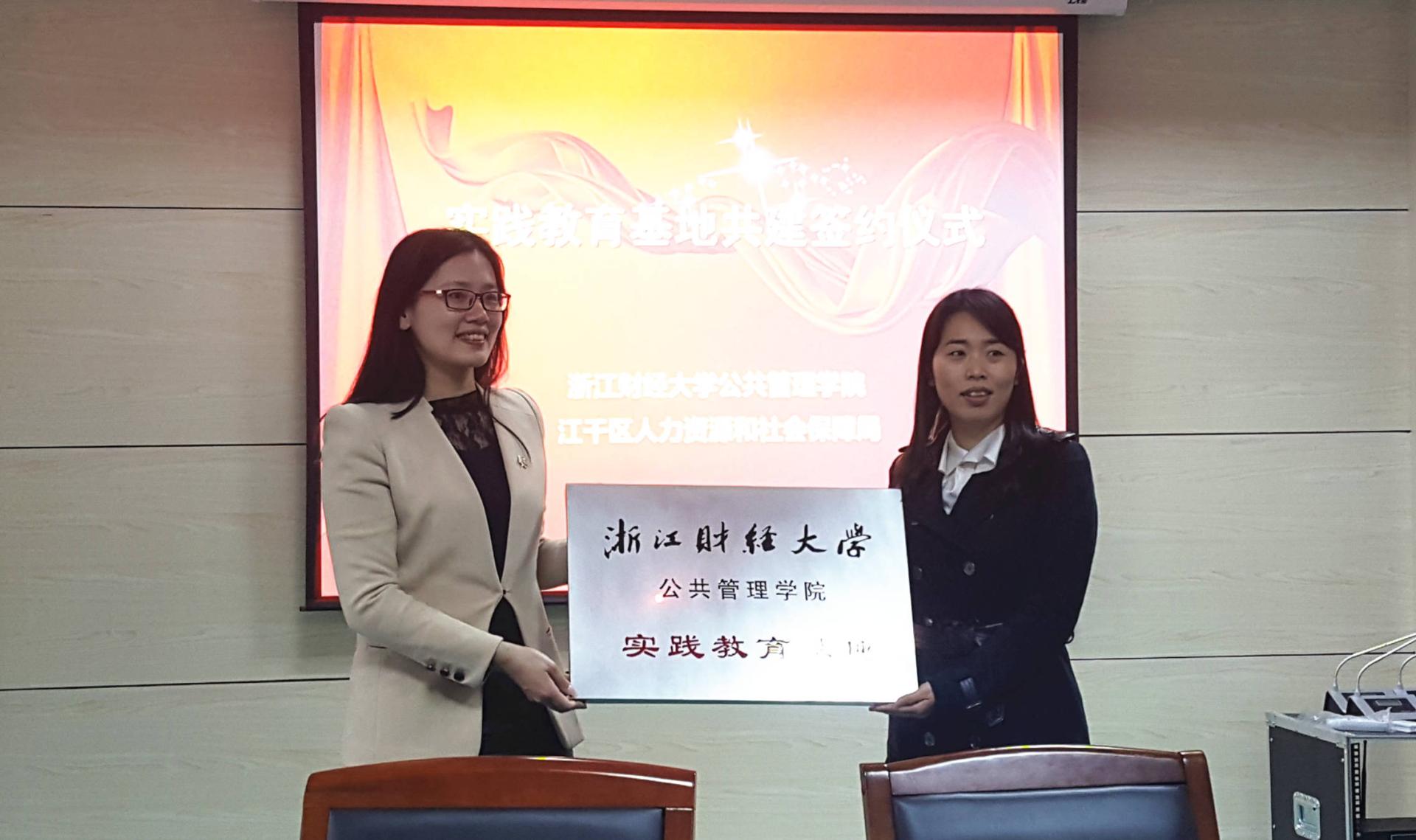劳动与社会保障专业与江干区人力与社会保障局实践教育基地合作签约仪式在社保局四楼会议室举行。杭州市就业管理服务局专业技能交流处处长叶金香、副处长肖春华,江干区人力社保局副局长姚燕丽,学院党委书记沈晓敏、社会保障学科带头人戴卫东和系主任黄志岭老师等相关人员出席参加仪式。仪式由江干区就业管理服务处主任郑常华主持。在温馨隆重的氛围中,姚燕丽副局长与沈晓敏书记代表双方正式签署共建实践教育基地协议。