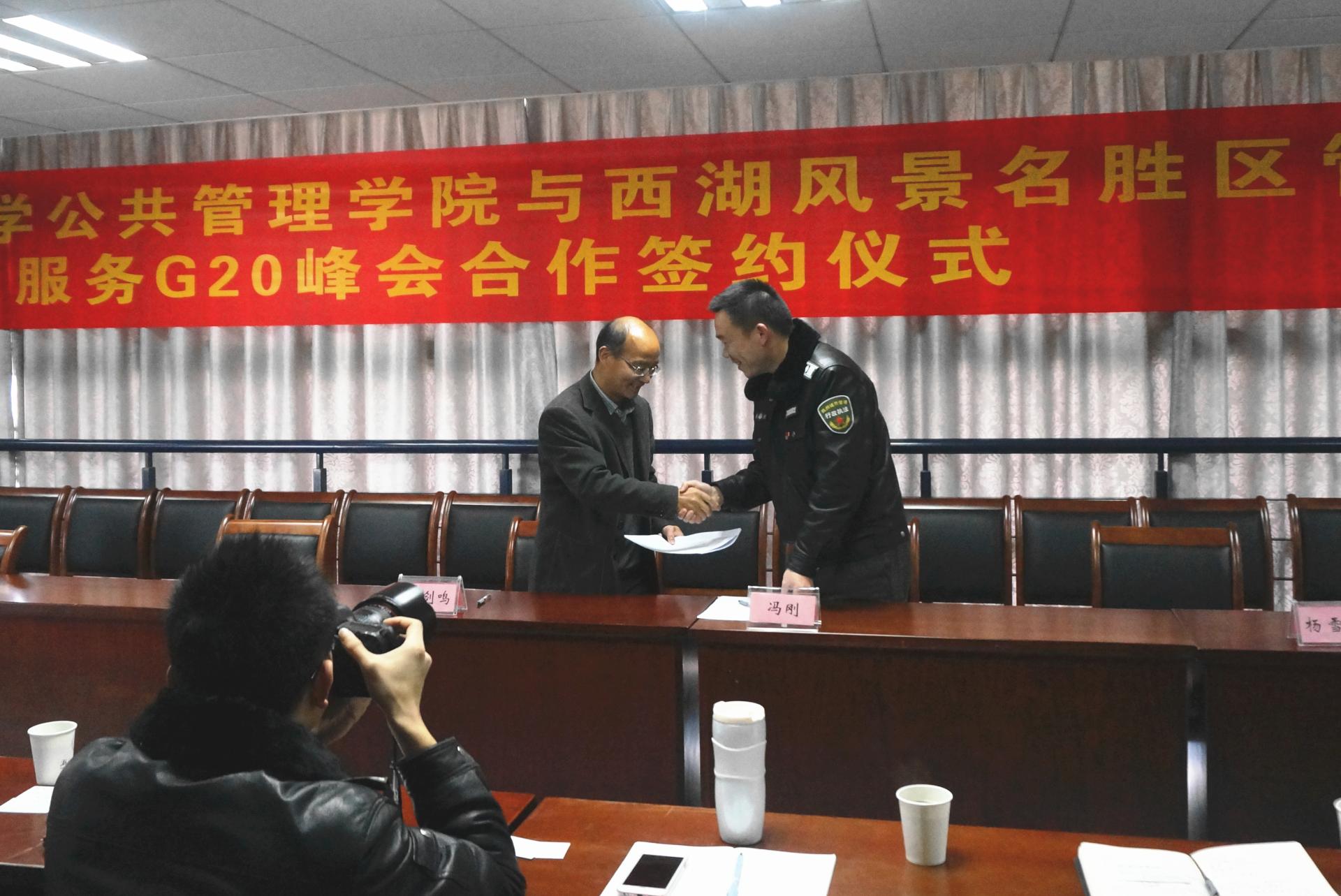 3月16日,我校黑人av 与杭州西湖风景名胜区城市管理行政执法局“服务G20峰会”合作签约仪式在一号学院楼举行,双方正式签订城市管理G20保障实习实训协议书。这是国内城市管理部门首次和大学进行合作。