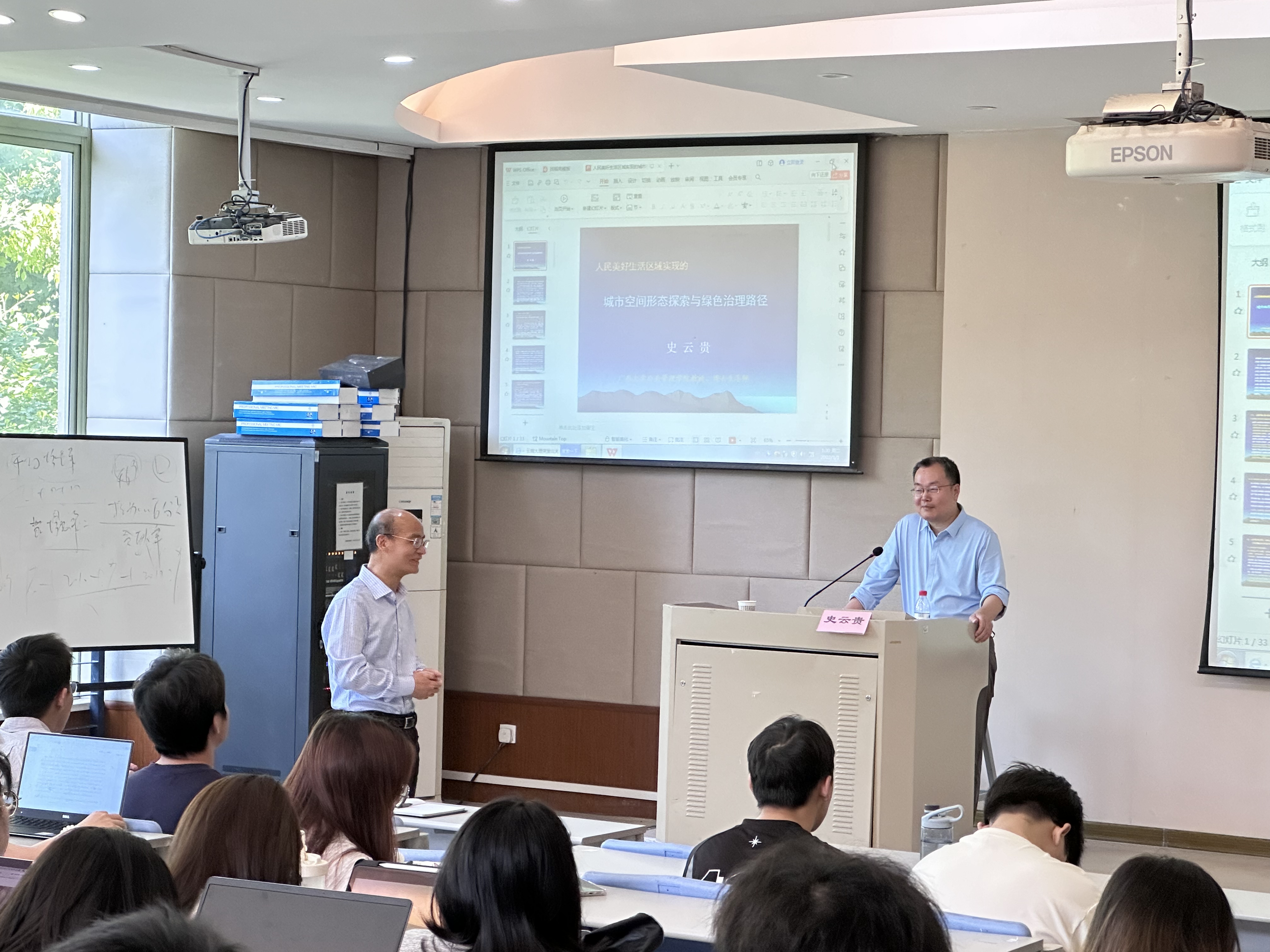师生做“人民美好生活区域实现的城市空间形态探索与绿色治理路径”主题讲座,讲座由郭剑鸣院长主持。