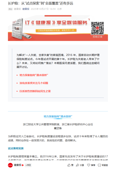 教授戴卫东接受《中国妇女报》《健康报》等多家媒体专访,就“十五五”规划建议中养老保障相关举措进行解读。戴卫东指出,“十五五”期间推行长期护理保险是促进人口高质量发展的重要举措,提出长护险应遵循“按人群分类、按服务分级”原则,构建覆盖失能失智老年人的康养护一体化服务体系,并建议通过长护险与医保协同支付康复护理、安宁疗护费用。此次解读系统阐释了“十五五”期间养老保障制度创新与老年人力资源开发的双重目标。一起来看看!