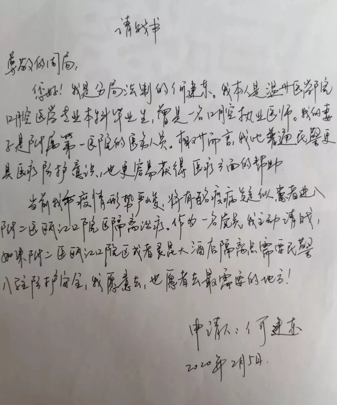 学院MPA学子来自基层各岗位,疫情面前,他们奋战在一线,成为最美“逆行者”。15级MPA学子、17届MPA毕业生何建东即是其中的典型代表,当得知温州版“火神山”医院——附二医瓯江口院区将收治新型冠状病毒肺炎确诊患者,何建东作为一名党员民警,面对疫情,在人民需要的时候选择逆行,一通电话,一封请战书,履行了一名党员的义务,践行了一名警察的使命!