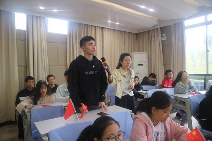 首先进行的是红歌竞答环节,现场党员分为“不忘初心队”和“牢记使命队”。第一项竞答内容是“辨曲猜名”,在热烈气氛中,“不忘初心队”以一分之差险胜。随后进行的“听歌填词”难度有所提高,但现场氛围也愈加热烈,《我和我的祖国》《南泥湾》等一首首耳熟能详的红歌旋律响起,竞答队伍通过举小国旗的方式获得答题权,同时现场其他同学也争先恐后抢答。不仅如此,同学们还能讲出每首歌的创作背景,革命岁月和国家建设时期,一代代中国人不忘初心,牢记使命,为了国家独立、民族富强而艰苦奋斗,才有了今天这美好生活。同学们纷纷表示要珍惜今天的美好生活,接过前辈手中的接力棒,更加刻苦地学习,为实现中华民族伟大复兴的中国梦而奋斗。