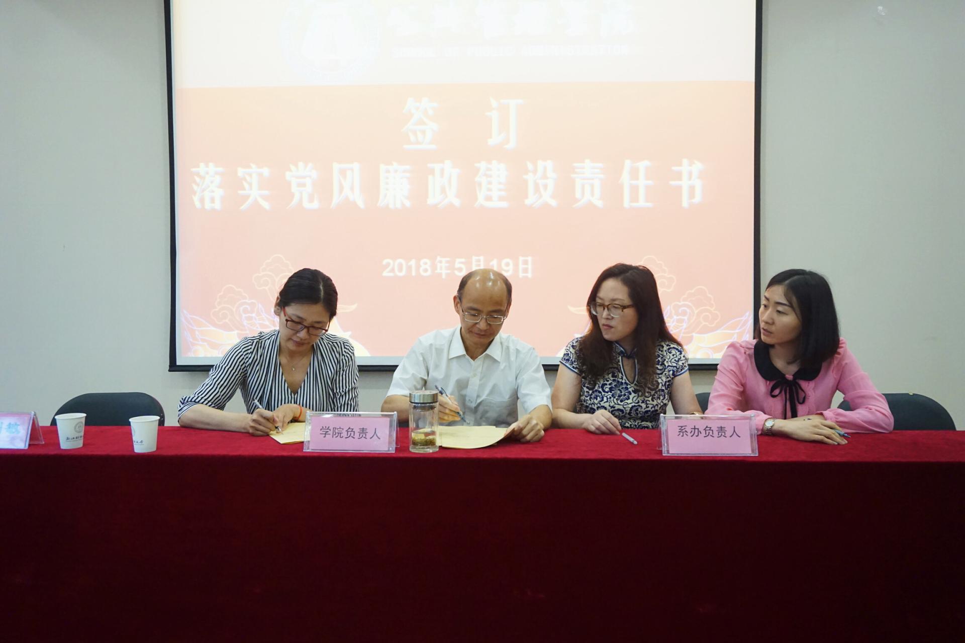会上,学院负责人与各系(办公室)负责人签订了落实党风廉政建设责任书,全体教职工签订了廉洁从教从研从业承诺书。