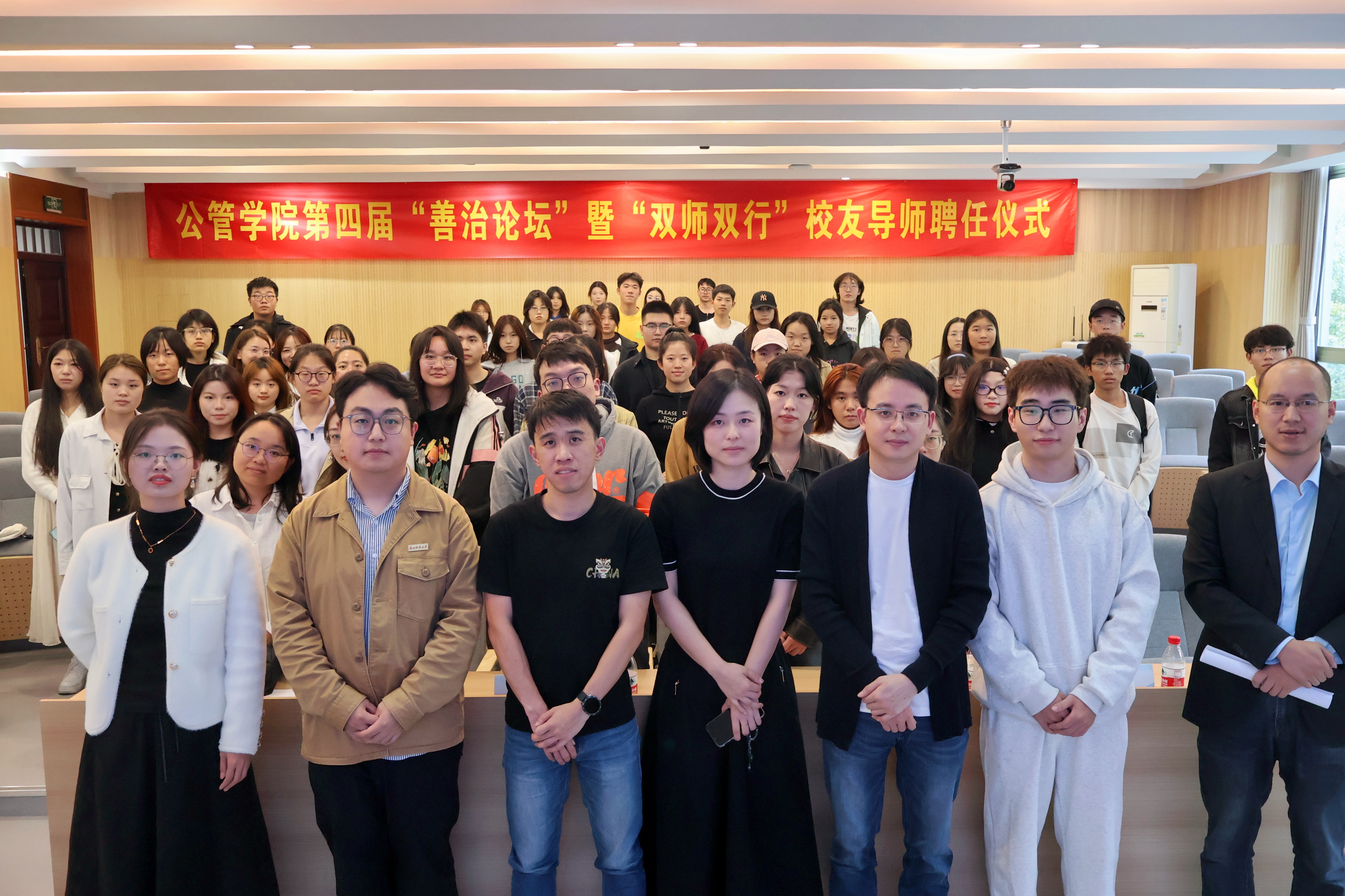 第四届“善治论坛”暨“双师双行”校友导师聘任仪式在学院楼208报告厅如期举行。本次活动特邀多位杰出校友导师,旨在通过分享他们的求学与职场经历,引导在校学生树立正确的学业规划与职业选择观念。