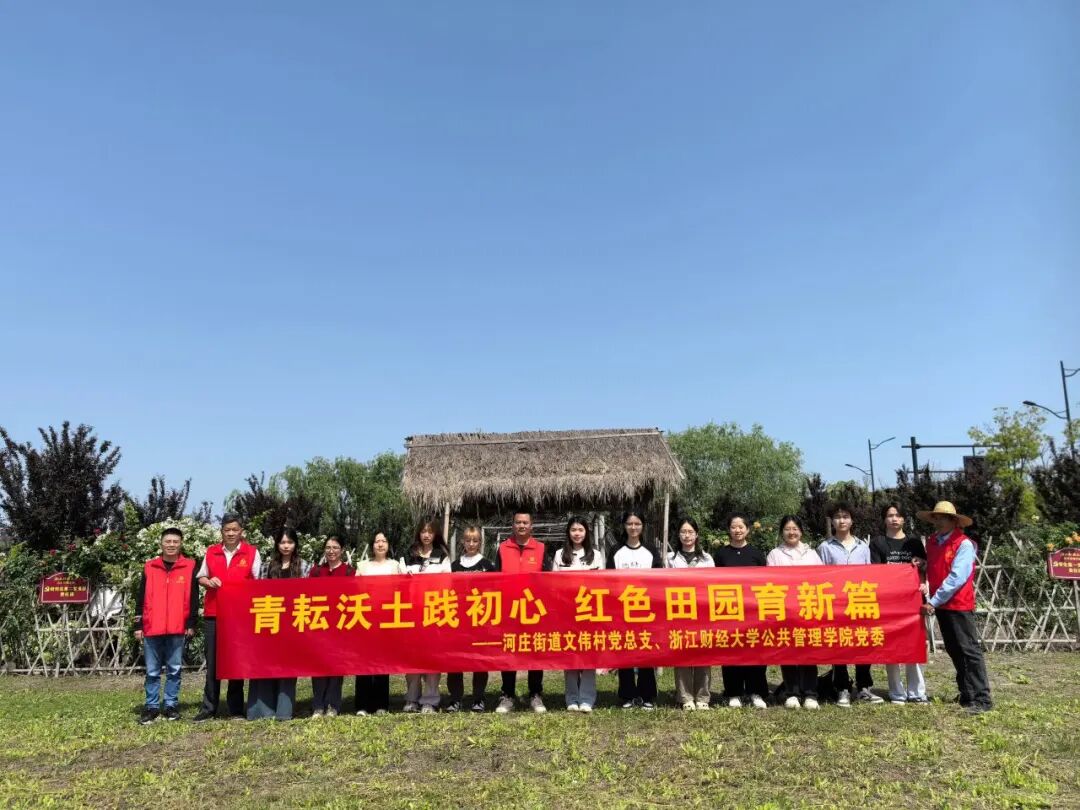 学生第一党支部书记刘舒沁老师带领同学们走进钱塘区文伟村,以躬身劳作的方式迎接节日的到来,与河庄街道文伟村党总支部开启了一堂别开生面的“田间党课” 。