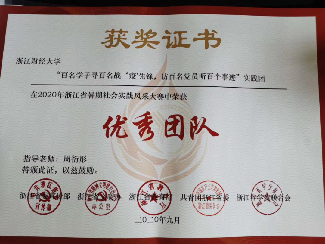 “百名学子寻百名战‘疫’先锋,访百名党员听百个事迹”实践团,在2020年浙江省暑期社会实践风采大赛中荣获“优秀团队”。