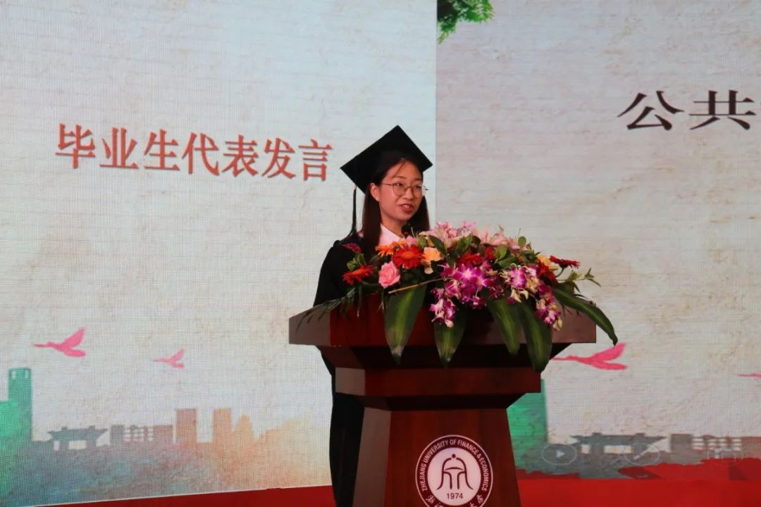 明天我们即将启程,未来或许不再有求知若渴的图书馆抢座,不再有沉甸甸的晨刷、课余锻炼,但无论身在何处,浙财赋予我们的思想和价值追求将永不褪却,“进德修业,与时偕行”是学校对我们的殷切希望,“精管为公,善治天下”是学院赋予我们的使命担当。一日浙财人,终身浙财情,回首来时路,砥砺再出发!最后,我谨代表学院2020届全体毕业生,衷心祝愿所有师长身体健康,万事如意!祝愿母校人才辈出,桃李芬芳!
