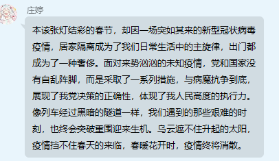 活动接近尾声,杨文超老师分享了观看视频后的感受,对第一党支部的党员同志们踊跃的捐款行动,积极参加志愿活动等事迹表示鼓励与赞赏,并叮嘱参与志愿活动的党员同志务必注意安全。最后,老师督促大家安心待在家中学习,坚持锻炼,增强身体素质,为抗击疫情贡献一份力量。