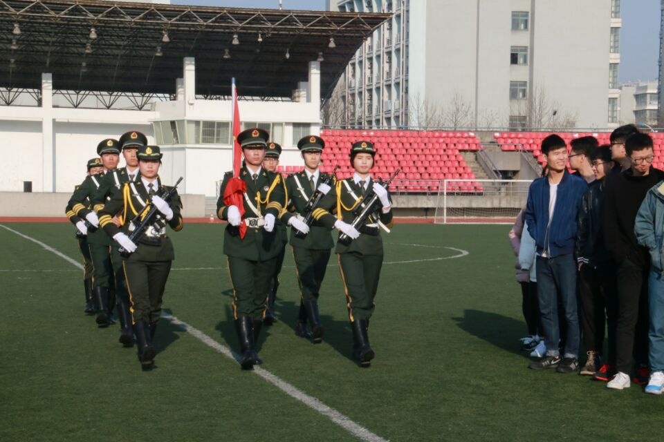 本次升旗仪式由16公管林成富同学主持。随着一声嘹亮的口号 “立正!”,升旗仪式正式开始。校国旗护卫队脚踏坚定的步伐,逐步穿过人群,来到升旗台下。随着熟悉的乐音响起,全体学生行注目礼,看鲜艳的五星红旗又一次缓缓升起,庄严而又神圣。