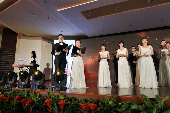 在雄壮的《歌唱祖国》伴奏中,朗诵会拉开帷幕。全场观众纷纷以准确的节拍和高昂的声音回应,“歌唱我们亲爱的祖国,从今走向繁荣富强!”现场的歌声为今天的红色画卷添上了浓厚的第一笔。