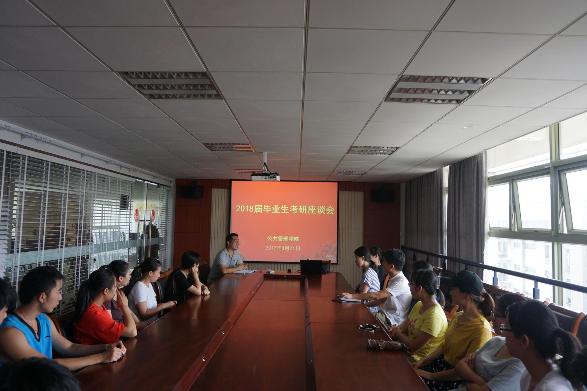 2018届考研学生代表,暑期留校复习迎考学生齐聚一堂,在学院楼517C室开展了一次专题座谈交流。学院党委副书记程晓东、学办主任杨文超等参加了座谈。