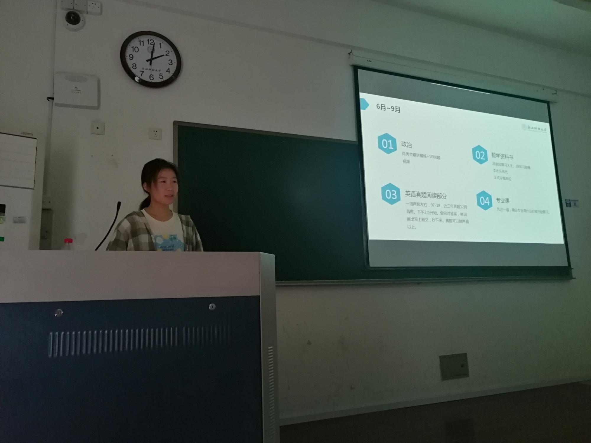 分享会开始,王霞学姐从考研复习时间安排,各科复习经验,考研阶段复习心态调整以及学校选择的经验来讲述,参会同学认真领会学姐的经验并对自己的考研计划做出来进一步安排。