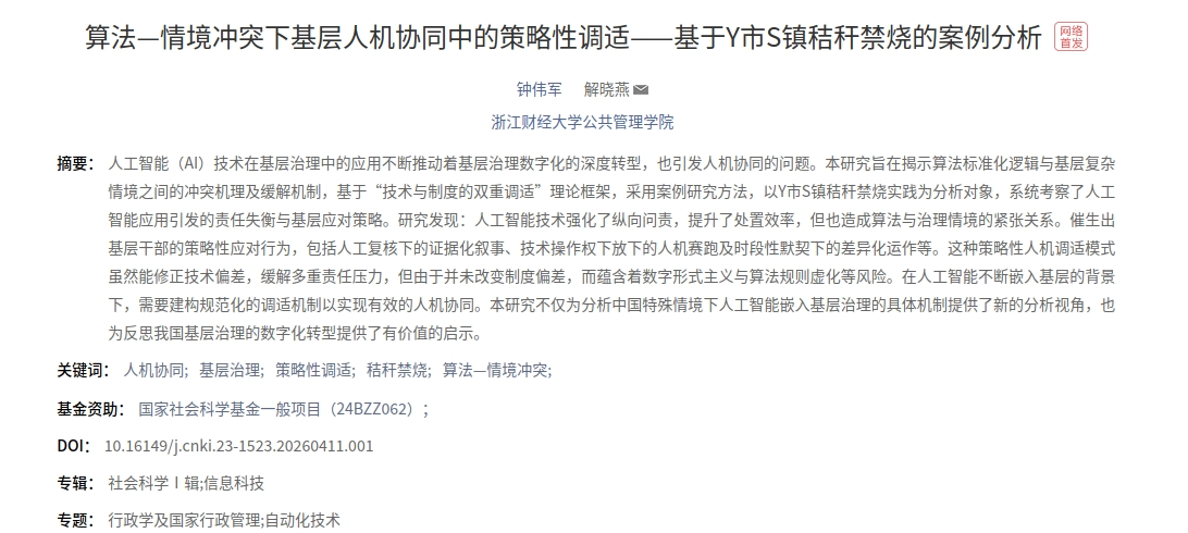 论文题目:算法—情境冲突下基层人机协同中的策略性调适——基于Y市S镇秸秆禁烧的案例分析