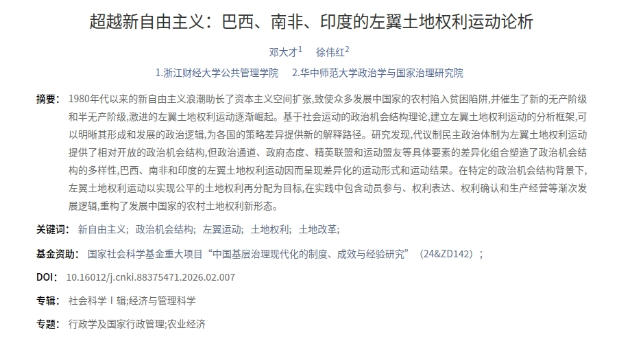 行政管理系教师邓大才撰写的论文《超越新自由主义:巴西、南非、印度的左翼土地权利运动论析》被《当代世界社会主义问题》录用并发表。